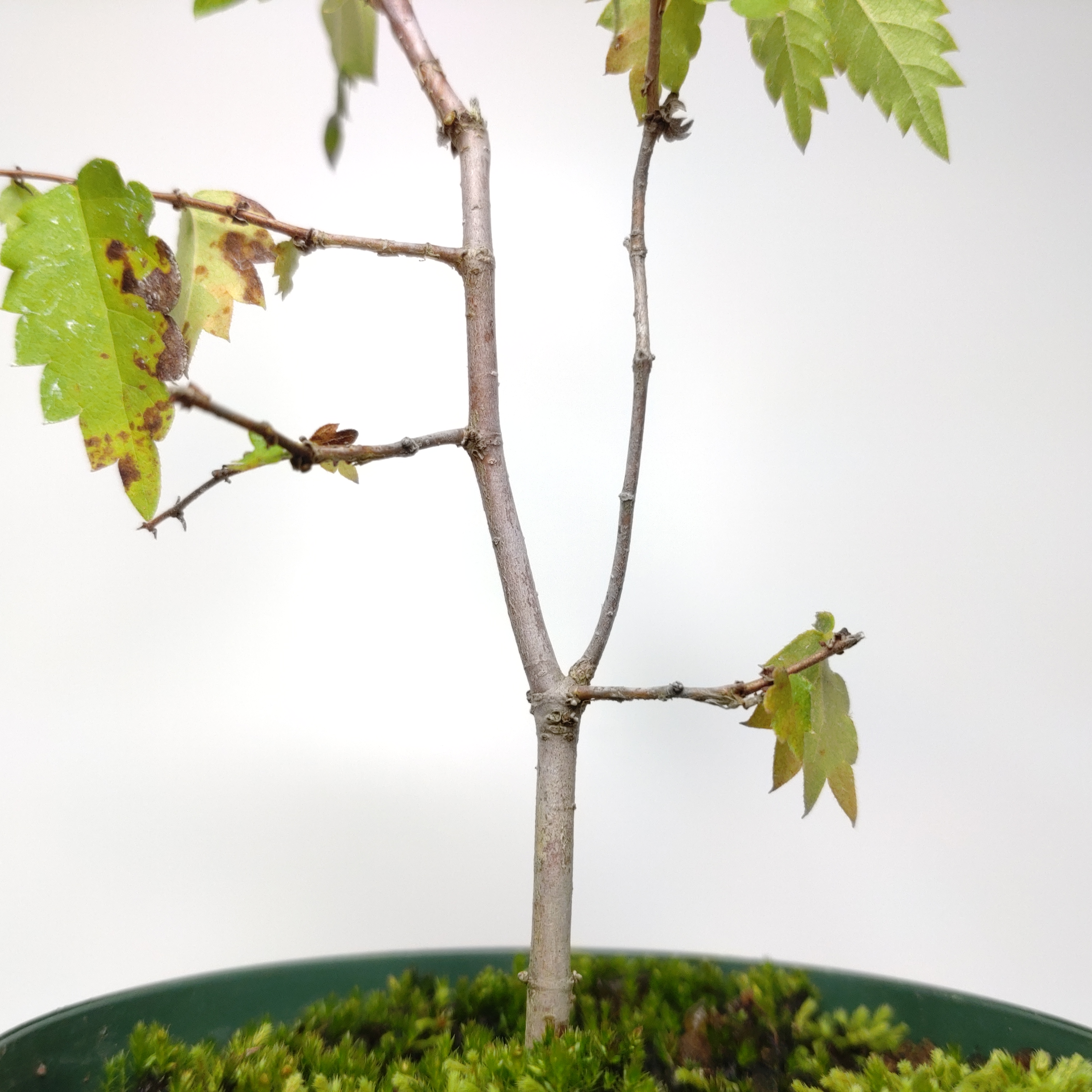 秋の黄葉は黄色からオレンジ色に変化し、味わいがあります。盆栽では、半球形を描く独特のほうきづくりを楽しみます。また、寄せ植えも盆栽でとても人気です。