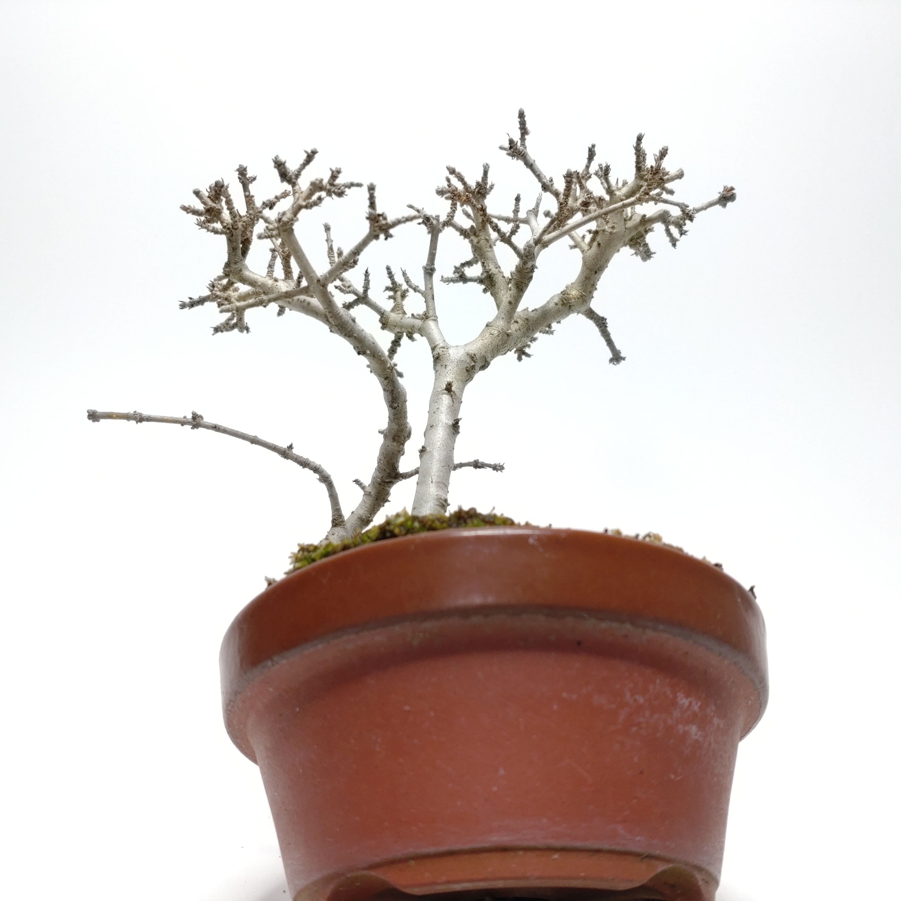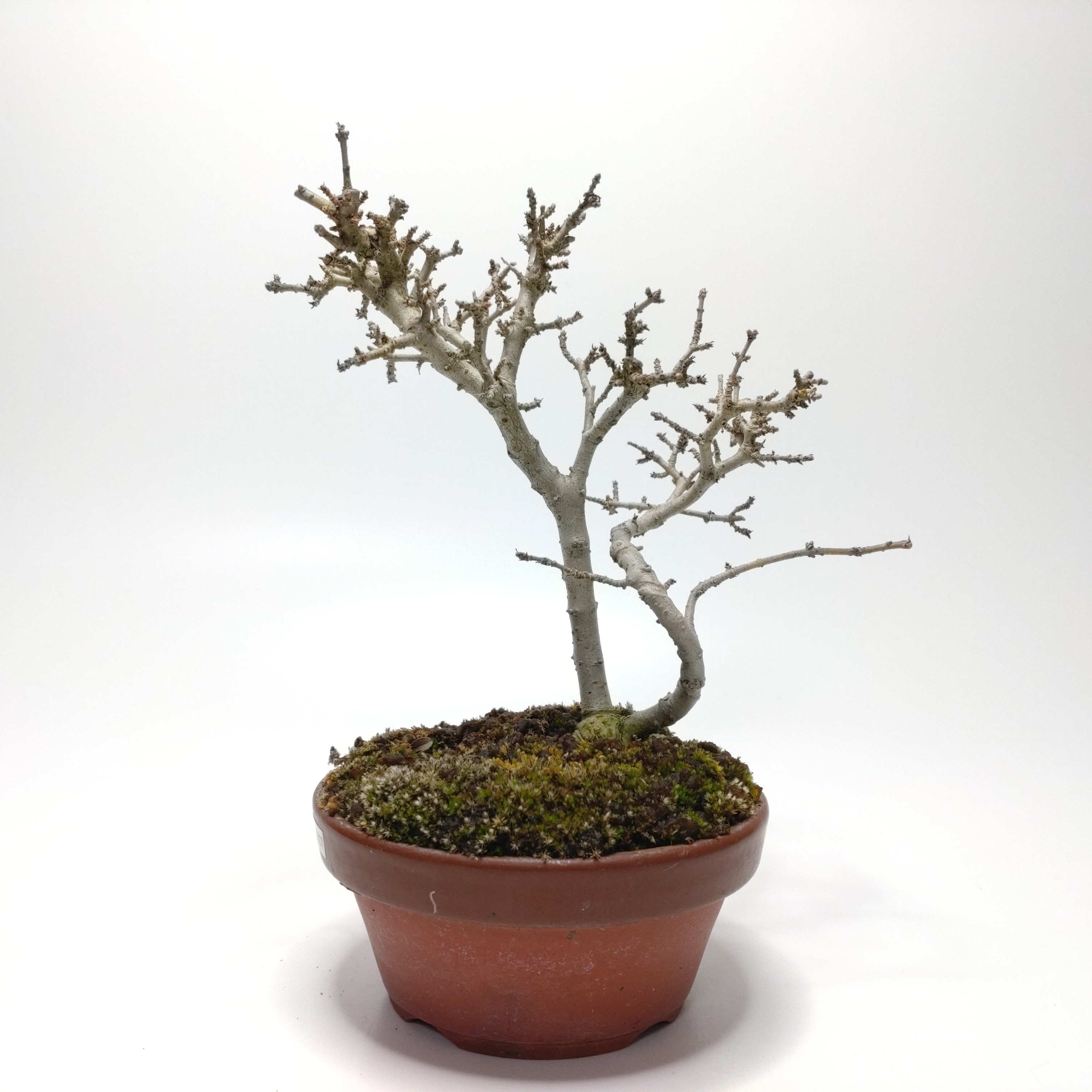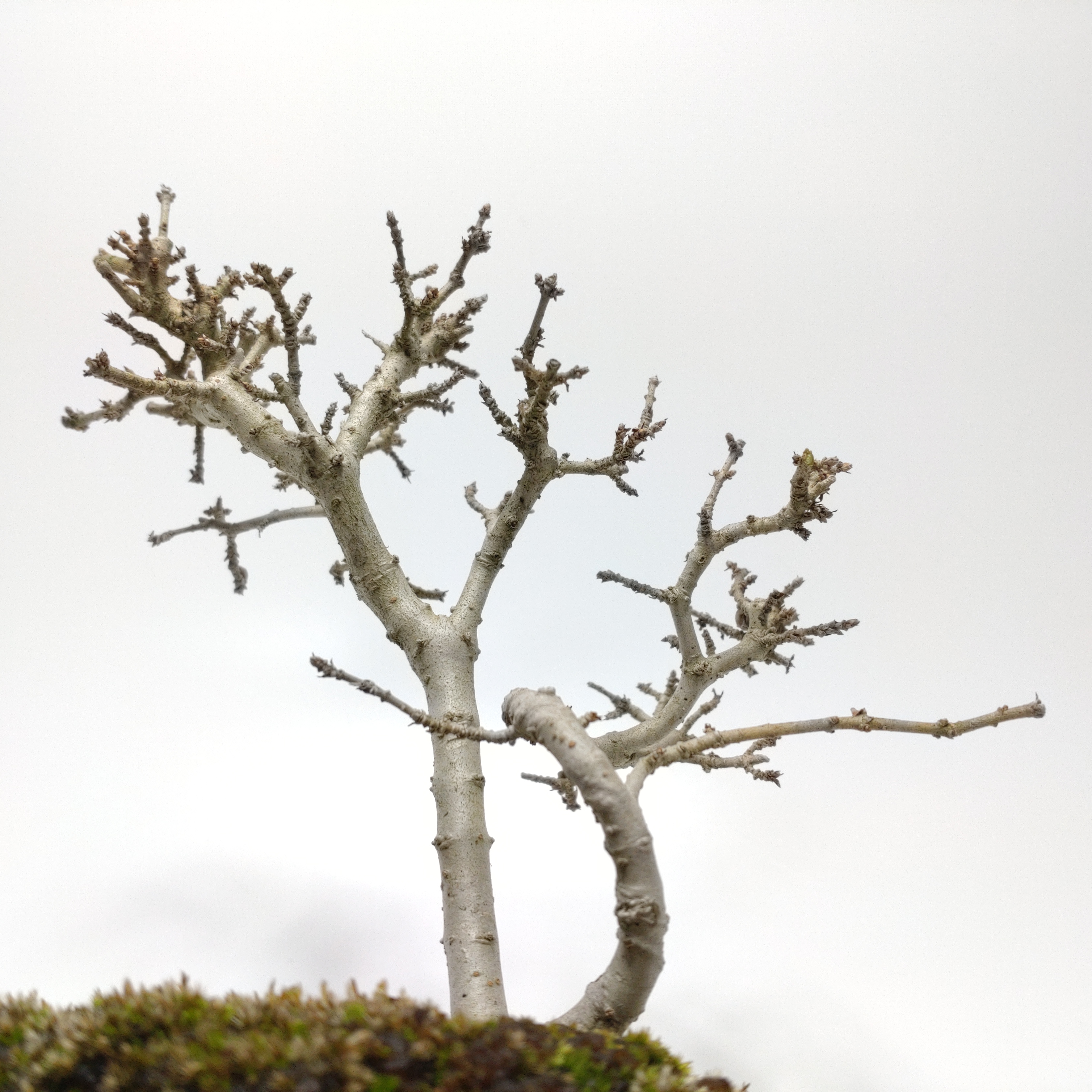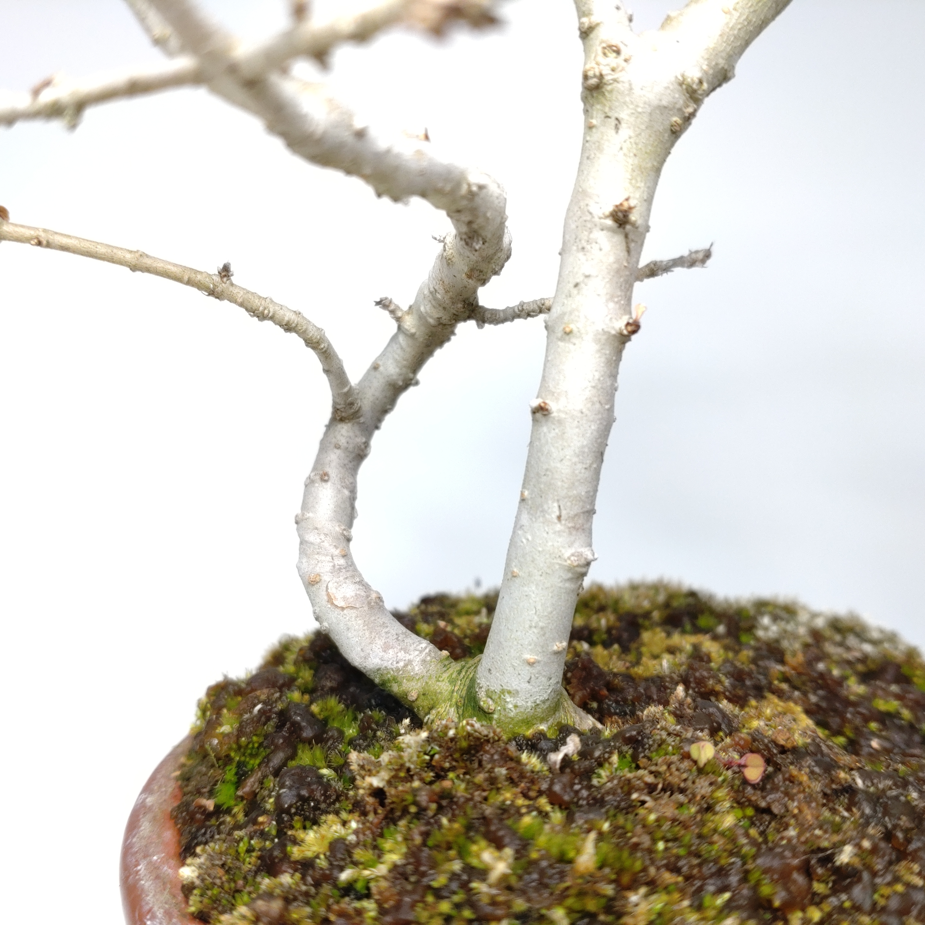 生長が早く、早い時期に幹がはぜて、古色感が出てきます。細かく繊細な枝が魅力で、葉刈りをこまめにすると、よく分枝して密になります。白い小花の房や、紫黒色に色づく実も、渋い味わいです。盆栽では、冬期の寒樹姿が人気です。